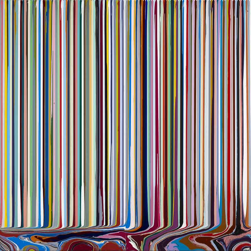 As one of the most prominent contemporary artists of post-painterly abstraction, Ian Davenport has injected new life to the practice of painting. The artist consistently creates complex colour arrangements in vertical lines of varying widths. Starting out to only have had experimented with monochromatic or subtle hues, he expanded his repertoire and proceeded to work with bright, vibrant tones from animated sitcoms in popular culture – such as The Simpsons. His works are formal and calculated, but also vulnerable to unassailable forces of gravity and chance. Seeking inspiration from Italian frescoes, cars, street signs, and Flamenco, Davenport works by pouring gloss paint from heavy-duty syringes spaced along the top of the working surface, and then tilting it, or simply allowing the paint to overflow and ooze into concentric puddles. Borne out of rigorous experimentation, the artist creates works that explore physical and psychological relationships between the viewer and his visual culture with sensory immediacy.