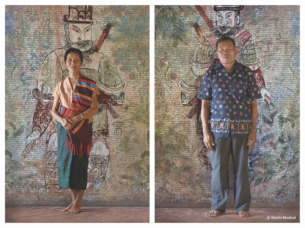 Shirin Neshat explores perceptions of love, sexuality and ageing by accentuating the lyrical and musical competition between couples during a traditional courtship Laotian ritual. With the participation and help of a group of Laotian male and female singers as well as anthropologist Catherine Choron-Baix, Neshat filmed and produced the series Games of Desire. This series features a set of 14 colour photographs and 6 film sequences of the Laotian people posing in front of a background covered in lyrics of these courting songs written a Farsi – a nod to her previous series, Women of Allah.