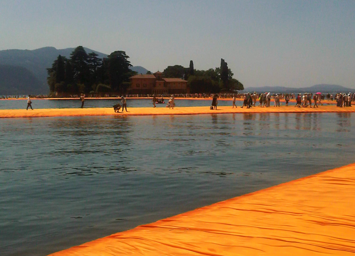 I hear in the crowd that the piers are sinking and that the authorities are closing access. I get there. The queue is not as bad as I had imagined and I embark on the crossing. The pier is a series of floating cubes attached to one another and covered with a bright orange double weave sail type material. The sides are wet and dark, the middle is hot and dirty. The orange shines brightly across the lake, the island and all around. People, like ants are following this strange path, like a “yellow brick road” in the Italian country side.